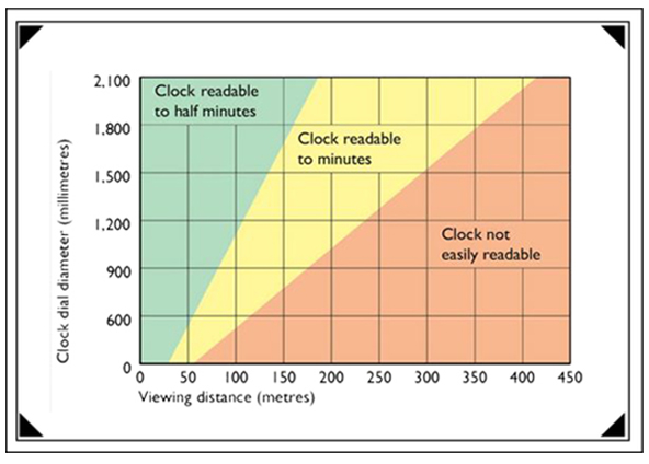 Dial Size,design,color scheme,height above ground and viewing distance all effect ease of telling the time.As a general guide,dial diameter should be one tenth of the distance from ground to dial centre. The graph gives a guide to visibility according on dial size and viewing distance.For example,a dial viewed from 150 metres should be a minimum of 750mm diameter, or 1,700mm for easiest readability.